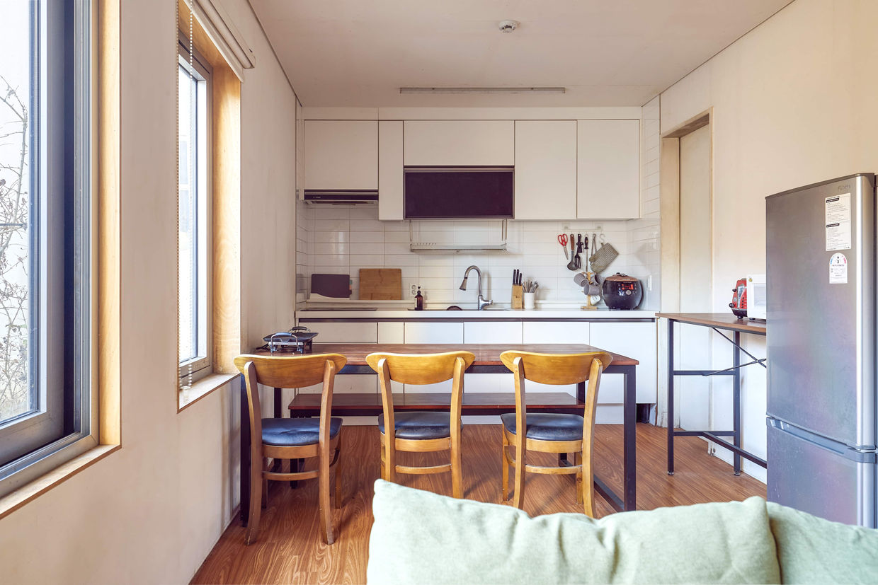 가스레인지/인덕션, 개별/테라스바베큐, 냉장고, 드라이기, 쇼파, 식탁, 에어컨, 욕실용품, 전기밥솥, 전자레인지, 취사도구, 커피포트, 타월, TV, 비데